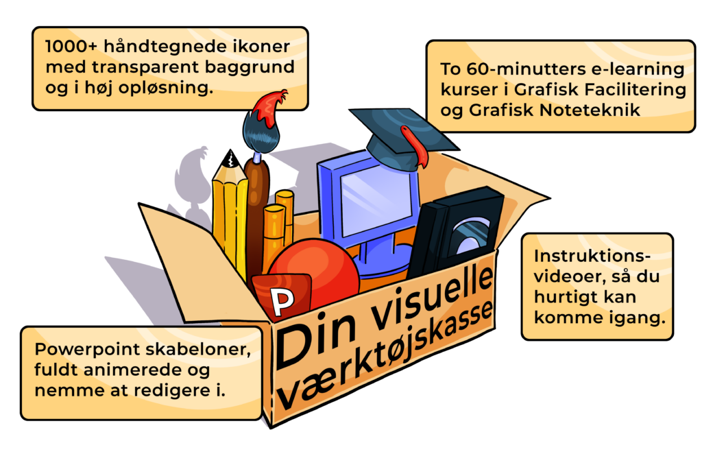 Og så inkluderer værktøjskassen også to e-lærings kurser, som jeg har lavet i samarbejde med AROS Business Academy. Kurserne giver dig de grundlæggende færdigheder indenfor “Grafisk Facilitering” og “Grafisk Noteteknik” på kun 60 minutter. Læs mere her.