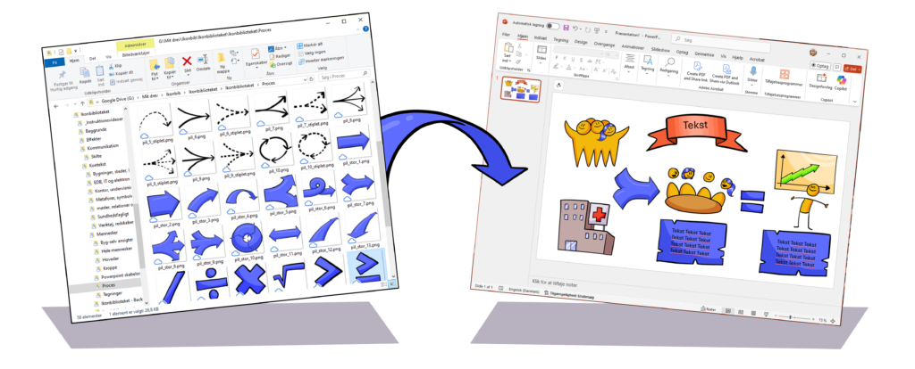 Det primære værktøj i kassen er mit ikonbibliotek, hvori jeg har samlet et bredt udvalg af grafiske ikoner (1000+), modeller, baggrunde og effekter, som du kan bruge i din visuelle kommunikation.